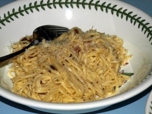 With impeccable timing, my better half showed up and suggested that the spaghetti become carbonara. The stars were aligned in his favor, as I had an abundance of good eggs, a chunk of guanciale, and plenty of Pecorino, Parmesan, and black pepper. No, I don’t use cream or butter in my carbonara: fresh eggs and good cheese make the dish far rich enough without it. Even if you don’t have fresh pasta, this carbonara is a treat. It is adapted from David Downie’s Spaghetti alla Carbonara recipe in Cooking the Roman Way; I have adjusted the egg and cheese ratios to my personal taste.