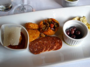 Pictured at left is the Campania antipasto sampler, including an eggplant-stuffed tomato, a napoletana sausage, artichoke hearts, fried provolone, olives, and tomato braised eggplant. (I was surprised by the starter’s size, wondering how I possibly might keep pace with three generous courses, and a bit sad knowing that I’d never make it to dessert.)