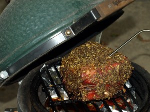 Taking inspiration from the fennel and garlic flavors of Italian porchetta, I mixed garlic powder, crushed whole fennel seeds, dried Italian seasoning herb blend, orange-zest sea salt, black pepper, and enough olive oil to make a paste and coated the entire piece of pork. After I stabilized the Mini at 250, the rubbed pork went onto the raised grid, with a crimped sheet of aluminum foil beneath the grill surface to catch the drips. I should have removed the Mini’s dome thermometer, as it poked into the pork when I closed the lid, but I was too lazy to find a wrench (and besides, the temperature was perfect before I put the roast on, so I wasn’t really worried about it touching the pork).