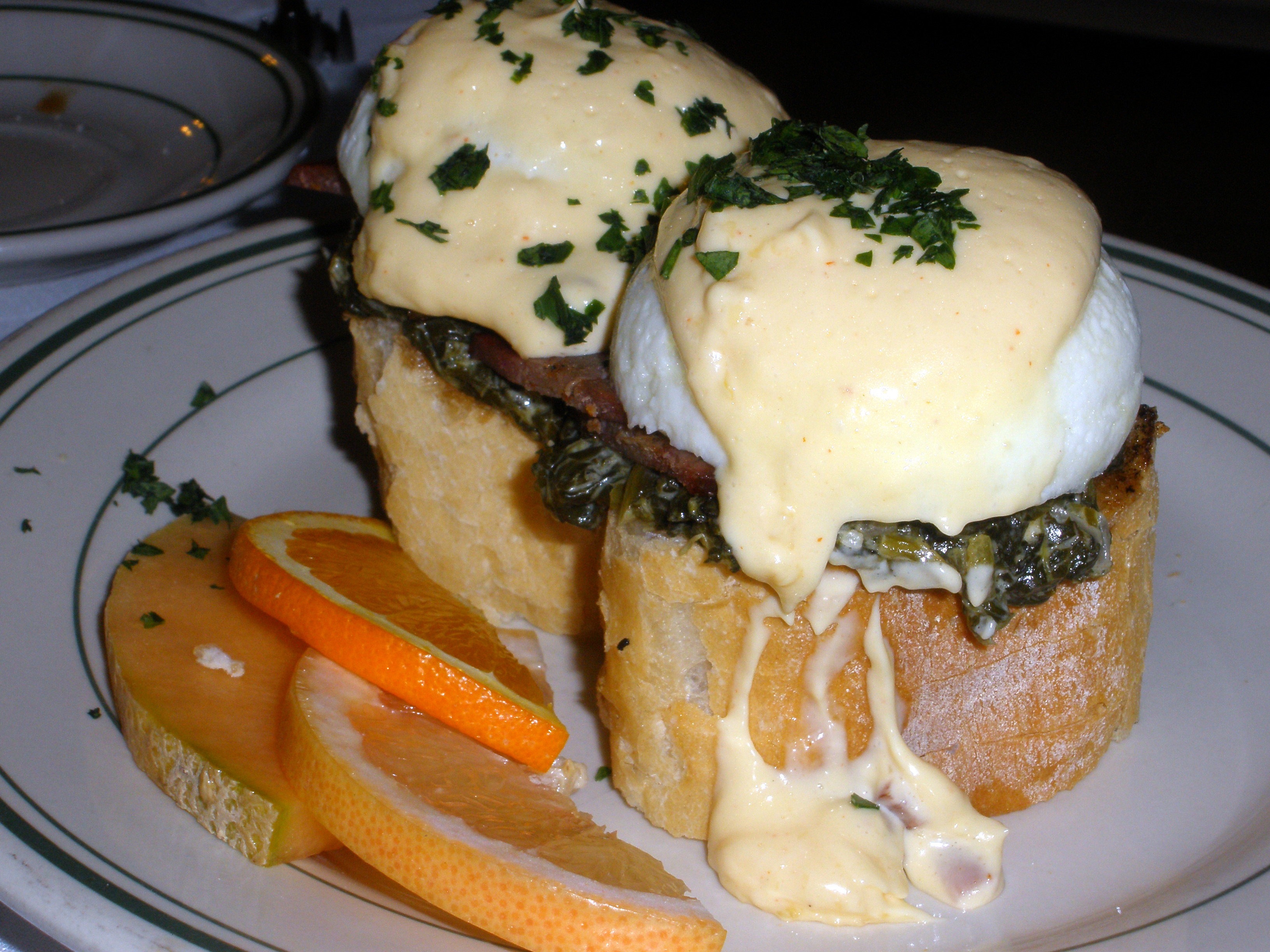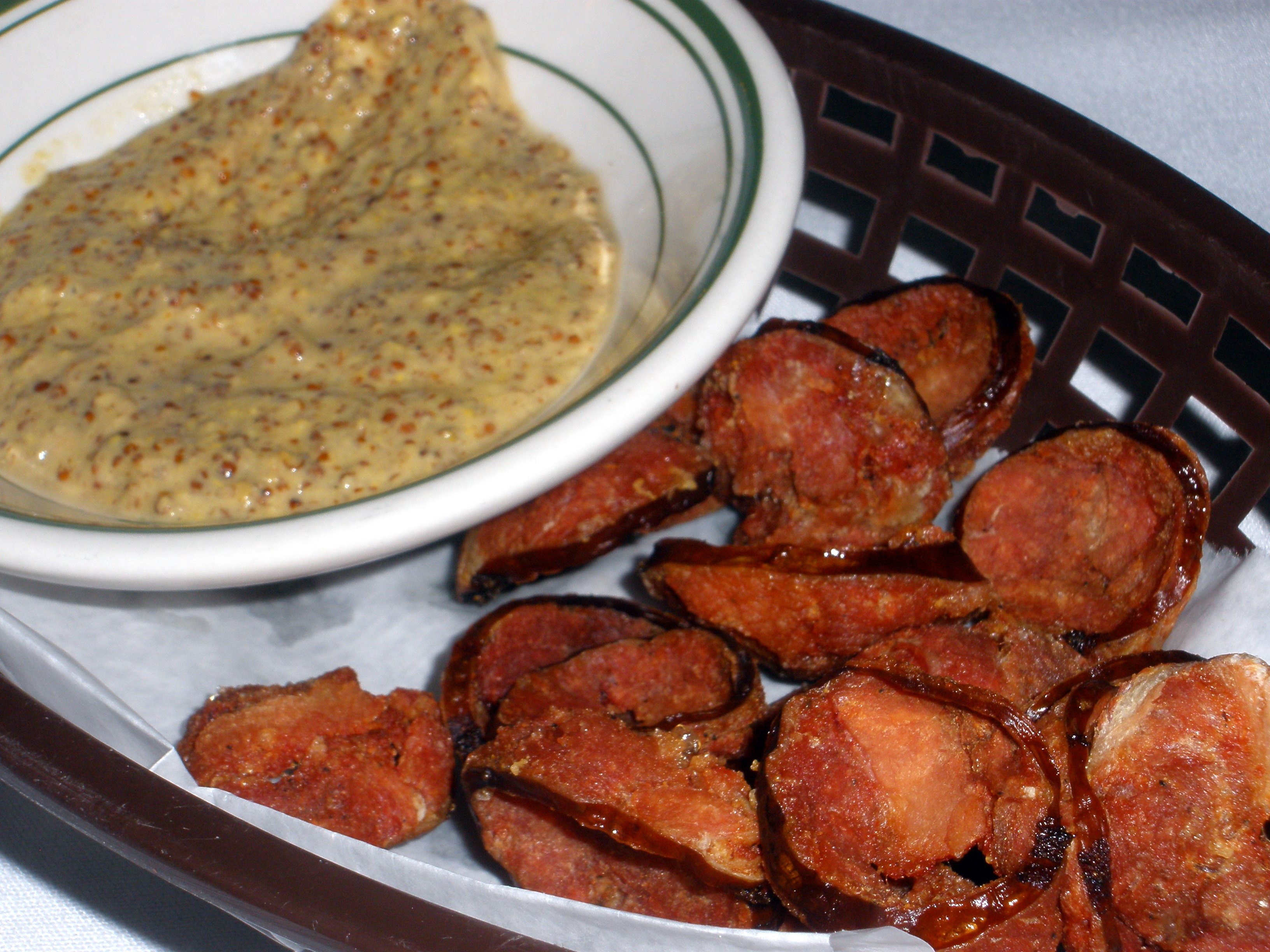 Of course, I timed my visit to Wayne Jacobs to coincide with brunch.  After a round of deep-fried andouille chips (pictured above; whoever thought of deep-fried sausage is my kind of person), I sampled the chicken and andouille gumbo (for inspirational purposes).  Mr. Bouillie devoured eggs St. John,  an andouille and french bread rendition of eggs Benedict.