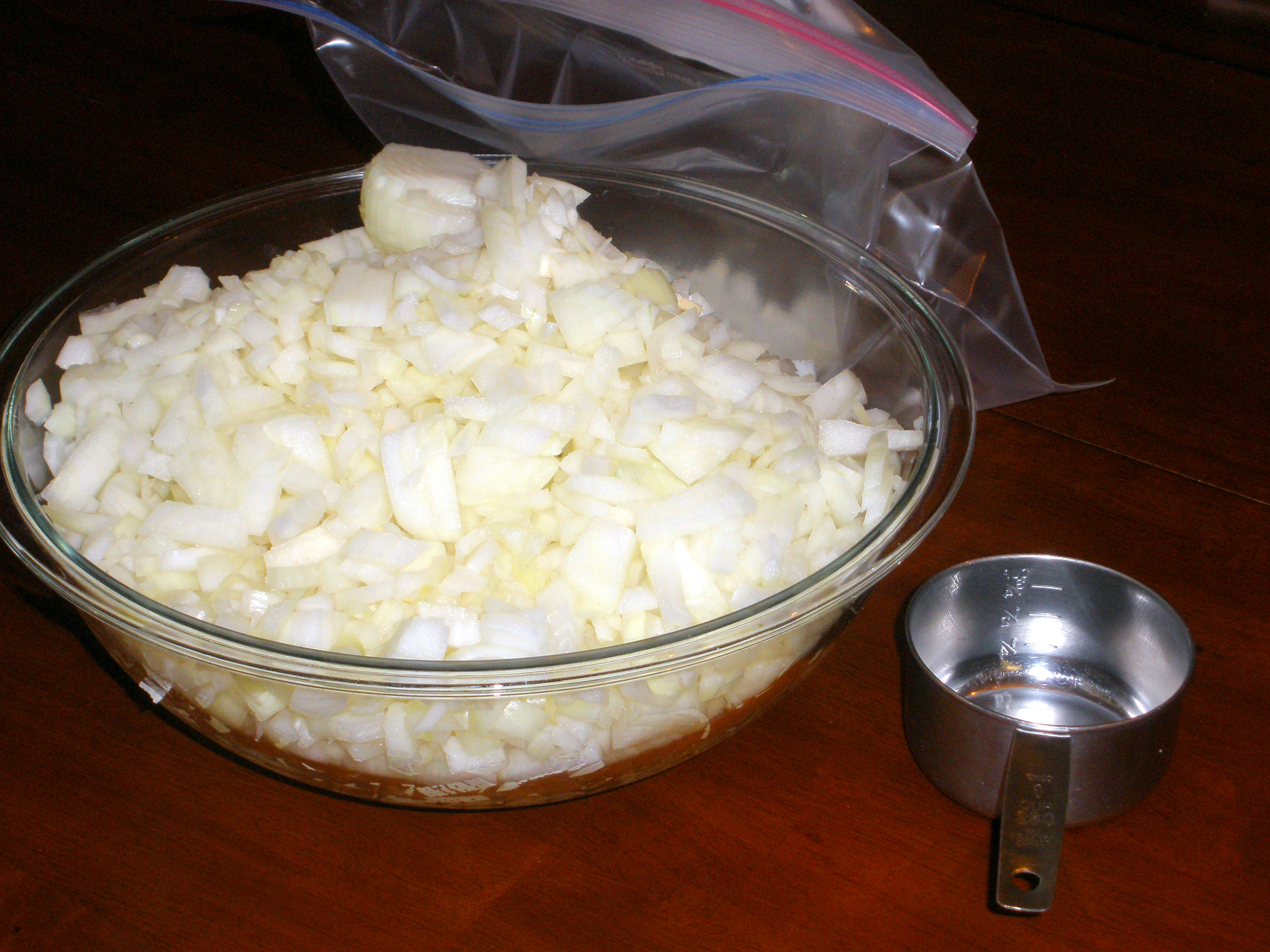 Ten pounds of onions, chopped and bagged before breakfast: I’m cooking 40 quarts of turkey/andouille gumbo at the Battle for the Paddle today.