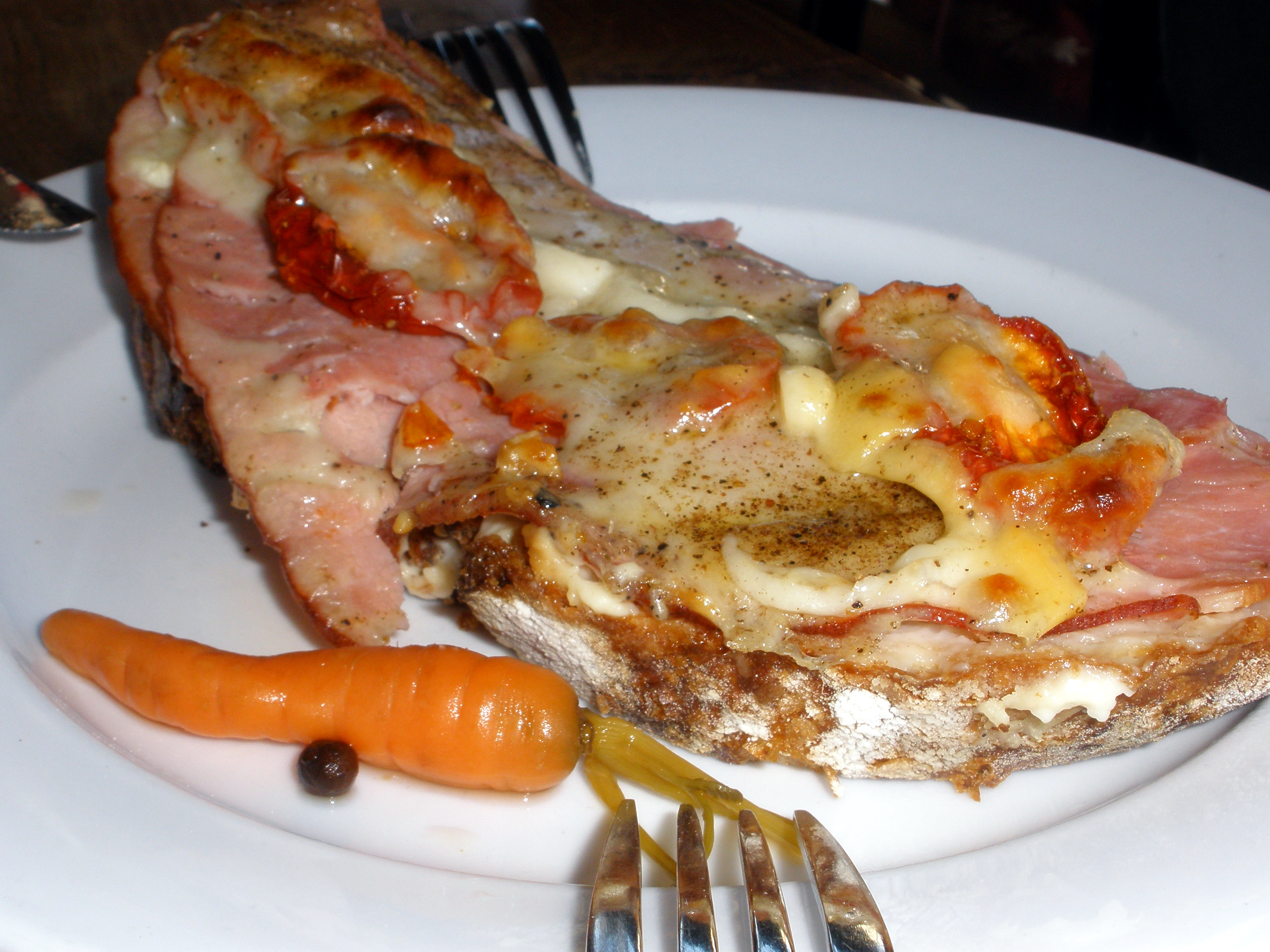 At Tartine Bakery, thick slices of the namesake bread are used in open face and pressed sandwiches, like the croque monsieur pictured at left.   Substantial slices of bread topped with gruyere, Niman Ranch ham, thyme, bechamel, and oven-roasted tomatoes result in a knife-and-fork sandwich; every part of the composition was superb, right down to the pickled carrot garnish.