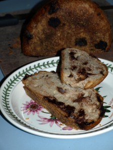 Tangy, crusty sourdough studded with hunks of Belgian dark chocolate, baked by the good people at Zingerman’s Bakehouse in Ann Arbor, MI.  I can’t stop eating it.