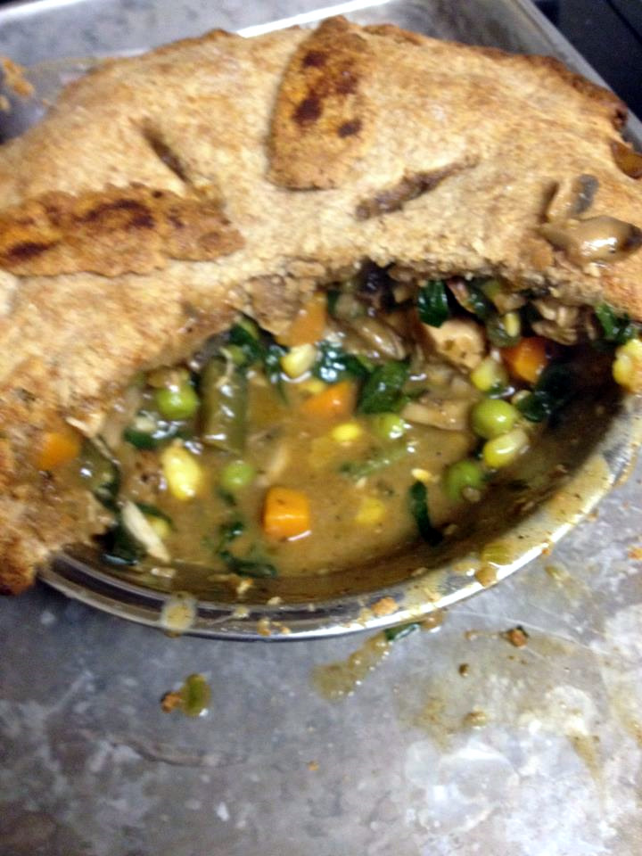 In honor of Pi Day, I give you…..chicken pot pie. With a pie crust in the freezer, it’s easy to make pot pie from leftover cooked chicken and whatever vegetables are on hand. I like a ratio of 1/3 chicken to 2/3 veggies plus garlic, onions, and herbes de provence. A little roux-thickened chicken broth ties it all together. (Maybe I should have used more roux, as the filling was a bit runny.)