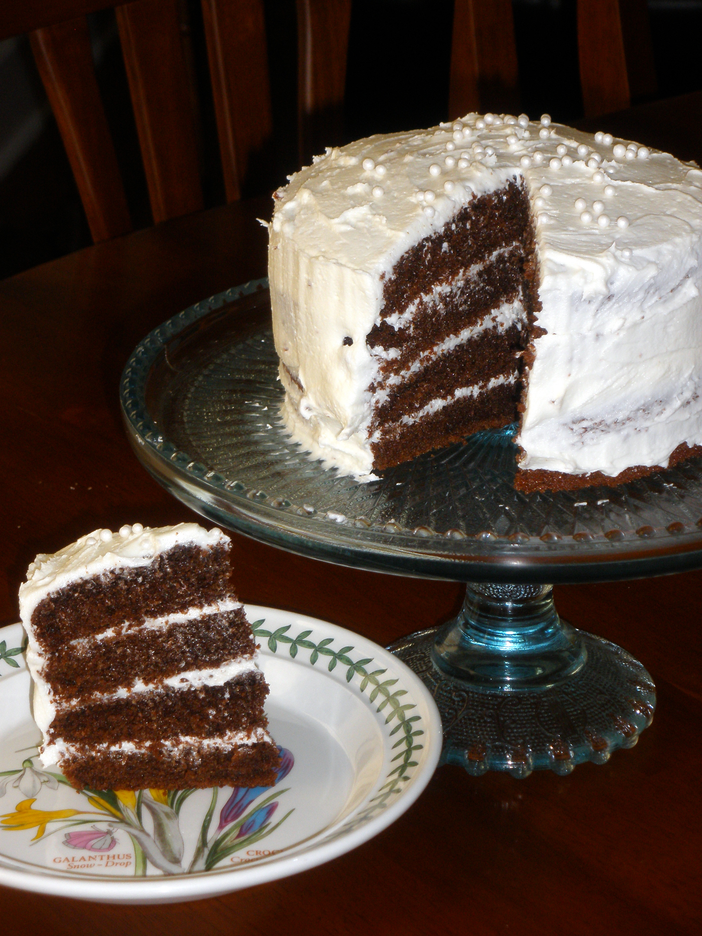 I frosted the chocolate layers with coconut almond buttercream and a scattering of sugar pearls, thereby undoing any of the flaxmeal’s positive nutritional attributes. (Or did the two merely cancel each other, leaving me with a guilt-free dessert?)