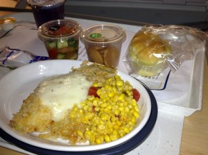Foolishly, I hoped that lunch would show improvement.  Boy, was I wrong:  the entire tray was a study in beige/off-white/yellow.  Pictured above is breaded tilapia under a white sauce, a pile of whole-kernel corn, a white-flour roll, vanilla cookies, and unsweetened tea.  I did manage to eat the salad course, a cup of cucumbers and tomatoes.