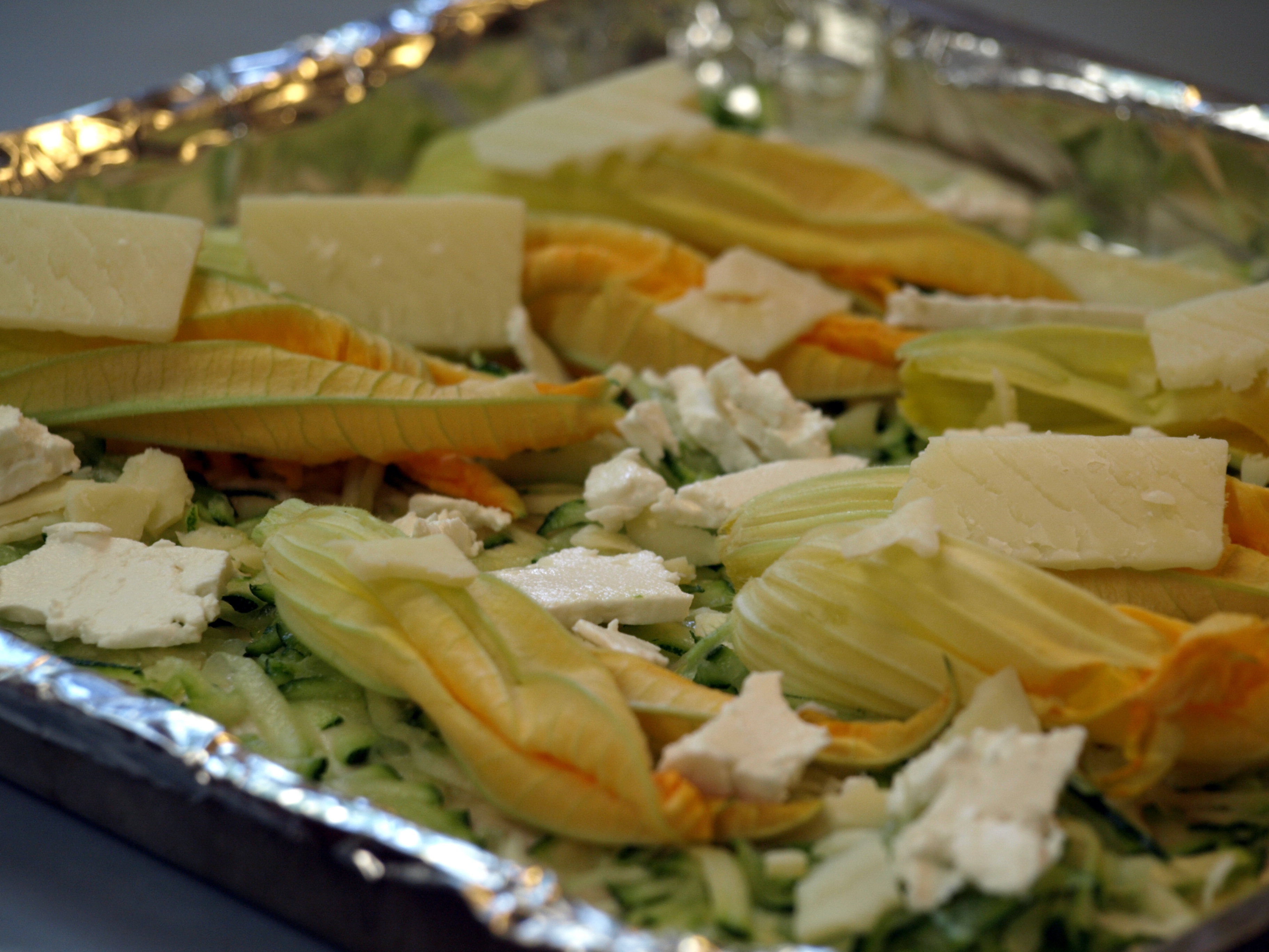 While I’m not that desperate (yet), I did top a pizza with grated zucchini, gruyere, and sheep’s milk feta , scattering a few squash blossoms atop it merely for color. The original recipe, sans feta and blossoms, is from Lahey’s My Bread, tucked into the chapter on pizza. (He has a new pizza book out–My Pizza–if you’re a fan of his food.) His technique calls for salting the shredded zucchini, squeezing the salted zucchini to remove excess water, then mixing the shredded squash with grated cheese. I simply layered the cheese atop the grated veggies, used his basic pizza crust recipe, and cooked it in my $30 Black and Decker toaster oven.