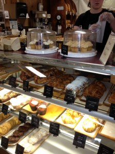 Adjacent to the retail space is a first-rate bakery, with made-on-site pastries, savory baked goods, a rotating array of breads, and a full menu of coffee and tea choices.  My chocolate croissant contained not one but two bars of chocolate.  (Over several days, I managed to sample the ham & cheese croissants, currant scones, raspberry bars, sugar cookies, as well as savory turkey and ham sandwiches on housemade bread.)