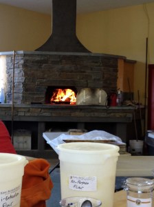 The class combined hands-on breadmaking with Hamelman’s detailed explanations of wood oven styles & construction, live fire management, using the oven’s rising and falling heat effectively, oven loading and unloading, and (best of all) delicious dishes from the oven. In the span of a day and a half, I and my twelve classmates made (and ate) chickpea-based socca, whole-wheat flatbreads of chapati flour stuffed with feta & cilantro, many varieties of pizza, tarte flambee (aka flammkuchen), five-seed sourdough, and large, naturally leavened miche loaves.