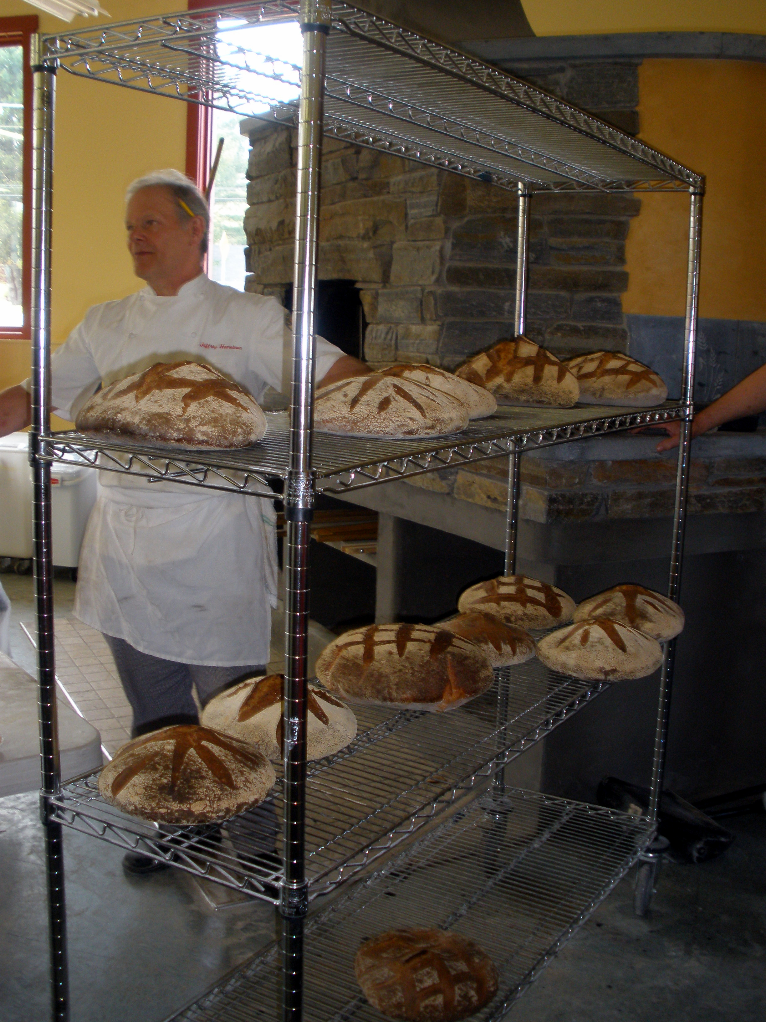 I headed up to Vermont last week to take a class at King Arthur Flour’s Baking Education Center. What lured me all the way to New England during JazzFest? A two-day class, “Baking in a Wood-Fired Oven”, taught by the company’s head baker, Jeffery Hamelman (pictured at left, with the wood oven just behind him and miche loaves in front). He’s the author of Bread: A Baker’s Book of Techniques and Recipes, easily one of the best English-language yeast baking books in print. Both the instructor and oven proved to be worth the trip.