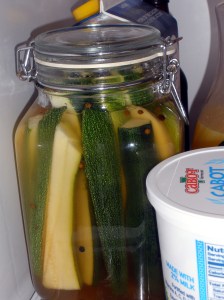 - zucchini (or other veggies), cut into long, skinny spears (enough to tightly fill your chosen jar)