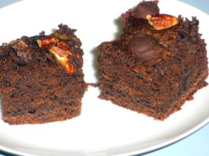 Note that I didn’t call this a lowfat brownie: it’s definitely not, as the recipe contains a whole stick of butter. But a typical American-style brownie batter for an 8″ baking pan contains two sticks of butter, so it’s definitely a lighter option. Thanks to the applesauce, the texture is dense, cakey, and very tender, akin to a moist chocolate cake rather than a fudgey-style brownie. Pecans and chocolate chips scattered atop the batter before baking help to tip the scales toward brownie and away from cake.
