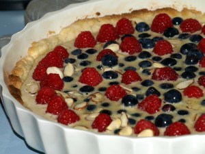 Truly, the crust is optional. Spoon almond cream directly into buttered ramekins and top with slivered almonds and berries–a spoon dessert worthy of company, yet easier to make than custard or pudding. Bake the almond cream and berries at 350, until browned and set.