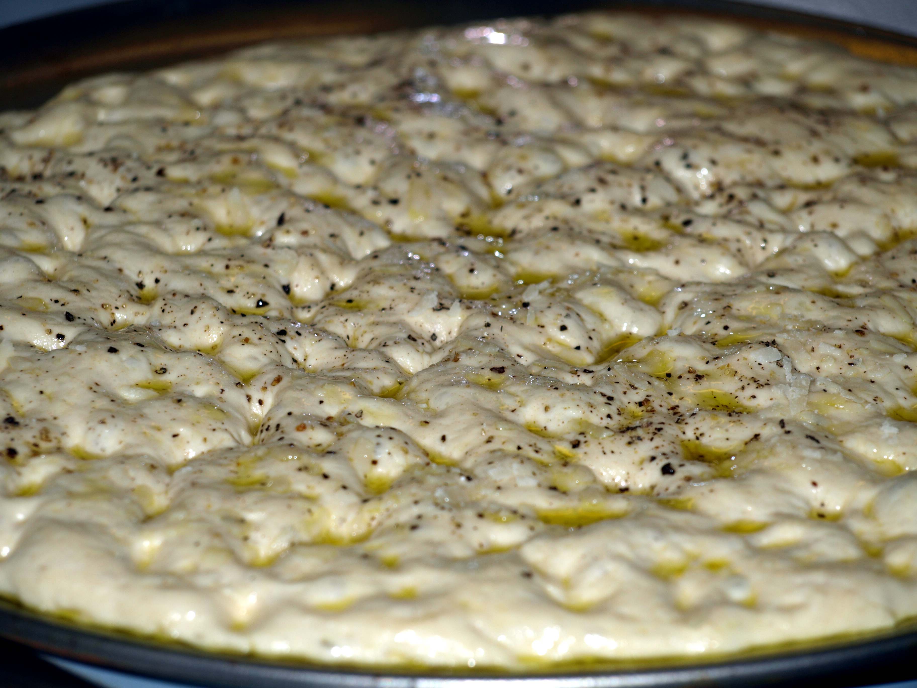 3. Drizzle remaining 3 T olive oil over the dimpled dough. Sprinkle with coarse salt, optional black pepper & parmesan. Cover with oiled plastic wrap and allow to rise again until doubled, about 1 hour.