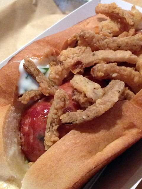 Company Burger also offers daily changing specials, so a a non-bacon-cheeseburger-craving diner will have choices. A recent smoked pork/green onion sausage from boutique butcher Cleaver & Co, pictured at right, nestled happily beneath fried onions on a toasted roll.