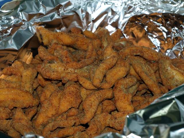 At these fish fries, a light breading (part flour and part cornmeal) seems to predominate, seasoned with a healthy dose of black and red pepper. More than a few groups dip the fillets in mustard before a quick roll in the coating meal. I haven’t run across any wet-battered fish, though.