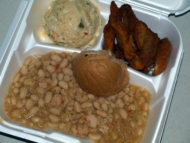 *Count the starches: flour on the fish, rice under the beans, potato salad, bread, and a flour-based dessert: five! You know it’s a real Cajun dinner when every single item involves a starch!