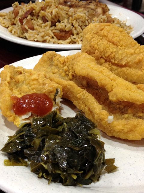 IMG_0827Fried Des Allemands catfish, mustard greens, jambalaya, and sweet potato pie:  sounds like a soul food joint’s daily specials, no?  Think again:  the lovely plate of down home cooking pictured is (gasp!) hospital food.  The locally caught catfish was fried to order, the mustard greens were just a tiny bit spicy, and the sweet potato pie (not pictured) could have graced a Thanksgiving table.  It’s typical of the food at St. Charles Parish Hospital’s The Oyster & Pearl Cafe, where red beans, grilled chicken, crawfish etouffee, seafood stuffed eggplant, gumbo, and other scratch cooking is a regular thing.  (Read the weekly menu here.)
